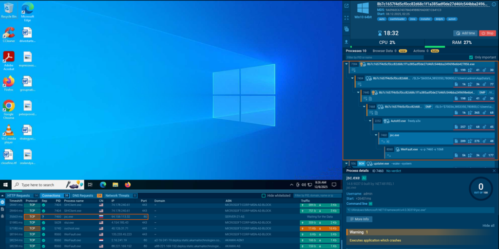 The launch of CastleLoader sample in ANY.RUN. Suspicious processes and network activities detected