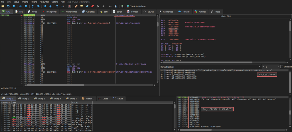 • kernel32.CreateProcessW creates the jsc.exe process flagged as CREATE_SUSPENDED.