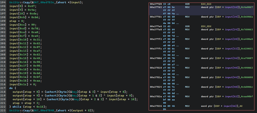 After manually decrypting several strings, we realized that the process could be automated. The extraction logic used by CastleLoader is known: it has a single UTF-16LE DWORD pattern, loop construct, and fixed addresses, from which the XOR bytes are taken. That’s enough to identify the repeating code fragments and write a Python script that extracts all strings from the dump in a single pass.