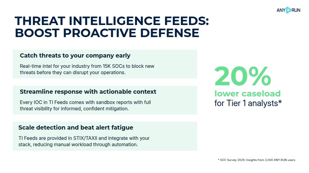 TI Feeds are powered by a global community of over 600,000 cybersecurity professionals and 15,000+ organizations who analyze threats daily in ANY.RUN’s Interactive Sandbox.