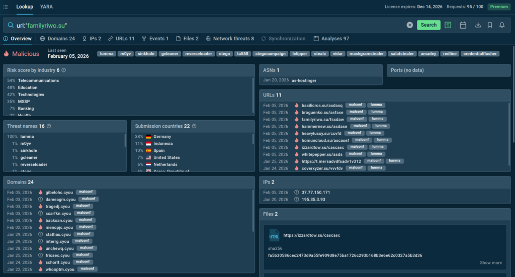 TI Lookup shows that this URL is related to a currently active Lumma Stealer campaign, which has been observed by companies in banking, telecommunications across Germany, Spain, and the United States.
