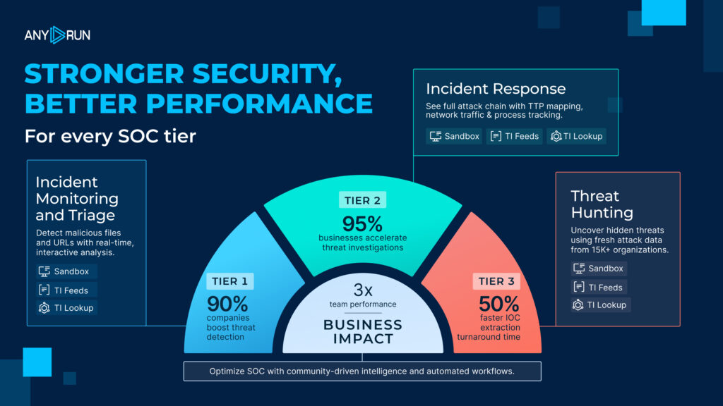 ANY.RUN is a core part of modern security operations, helping teams make faster, more confident decisions across Tier 1, Tier 2, and Tier 3. It fits into existing workflows without friction and strengthens the entire investigation lifecycle; from early validation to deeper analysis and ongoing threat awareness.