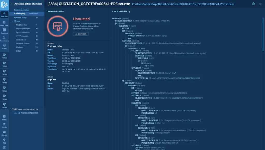Go to the code signing tab to see detailed information on certificates for both the module and the process — as shown in this task. You can also download them. Watch out for unsigned, expired, or untrusted certificates as they’re often signs of malicious content. For additional verification, you can generate a ChatGPT report specifically focused on the certificate.