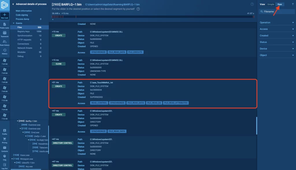 For example, some malware variants check the presence of files and directories specific for AV software. They halt their execution if they detect AV software capable of identifying them. Switching to Raw view expands the filter criteria, revealing additional events. In the example task above, if the aaa_TouchMeNot.txt file is present, the malware doesn’t execute. Being able to see additional events is crucial for gaining a complete understanding of the execution process.