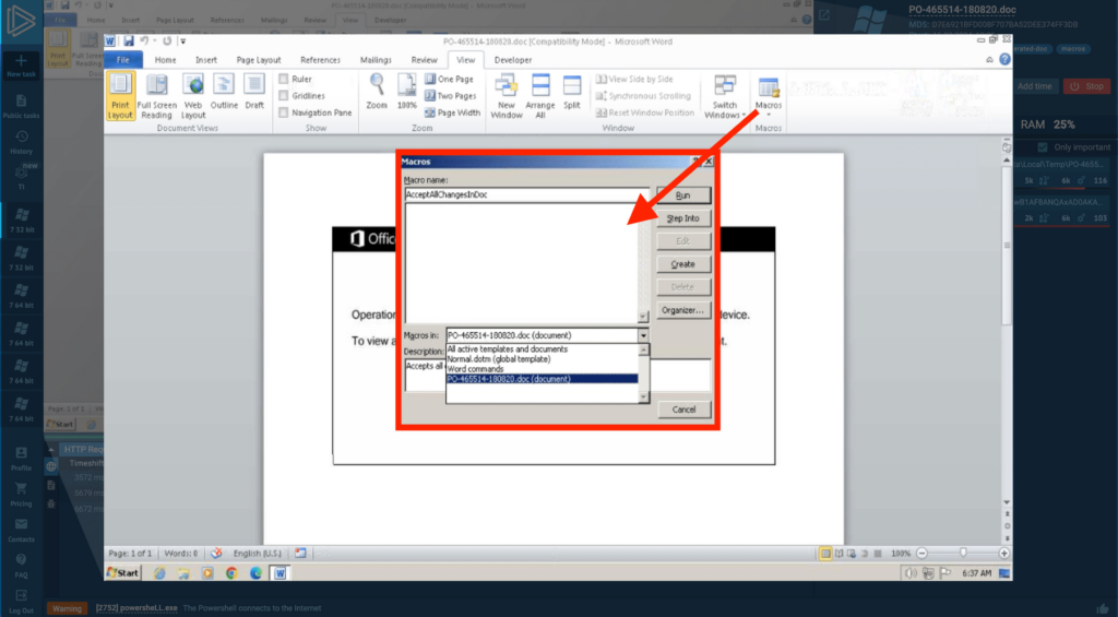 We can directly interact with the VM through the VNC (Virtual Network Computing) window at the center of the screen. VNC is a technology that enables to remotely control another computer. In ANY.RUN, it allows us to perform necessary actions within the system to run or view the macro in the cloud VM. Let’s first search for the macro in the most obvious location — the View Macros dialogue box (View Macros → View Macros).