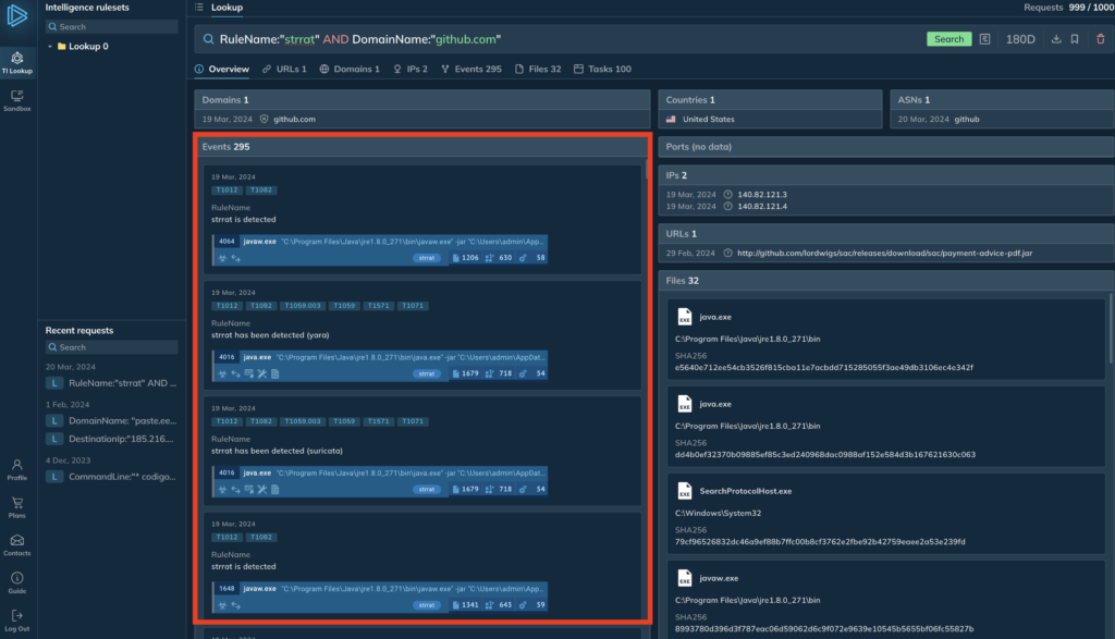 In the ANY.RUN TI Lookup, we can use the query constructor to build our query: ‘RuleName:”strrat” AND DomainName:”github.com”’.