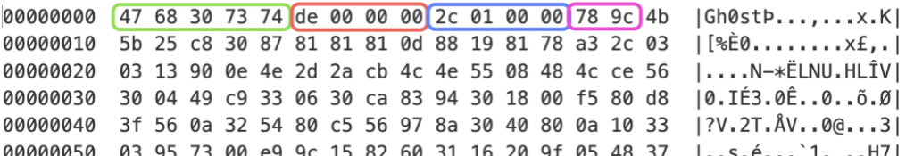 | magic bytes | packet size | decompressed size | packet type | |||||||||||||