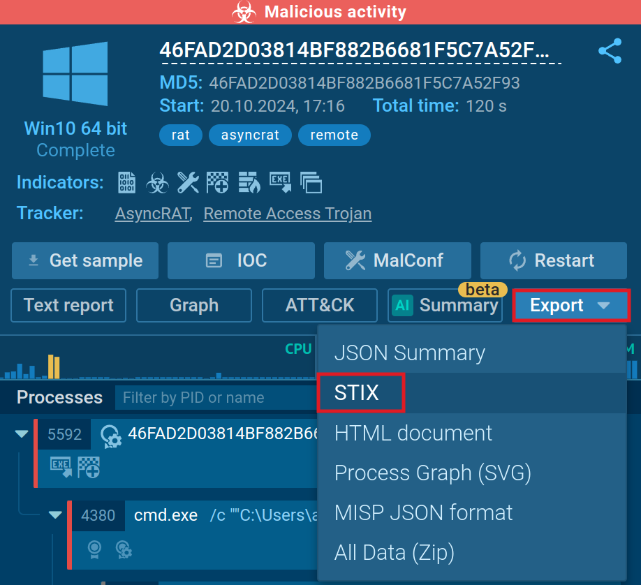 ANY.RUN lets you export collected threat data in the Structured Threat Information eXpression (STIX) format. It is a standardized language used to transfer cyber threat intelligence in a consistent and machine-readable format.