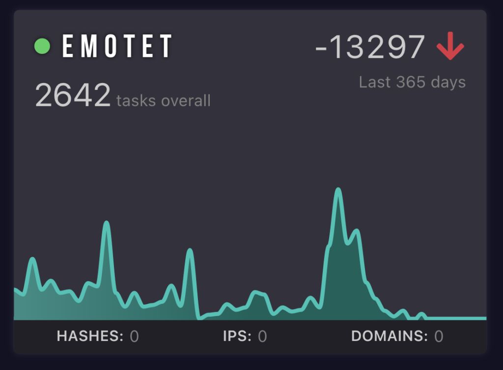 For example, taking this Emotet widget as a case study it’s obvious that the number of uploads rocketed and then plummeted within a year. The dip is when threat actors were arrested, stopping all activity.
