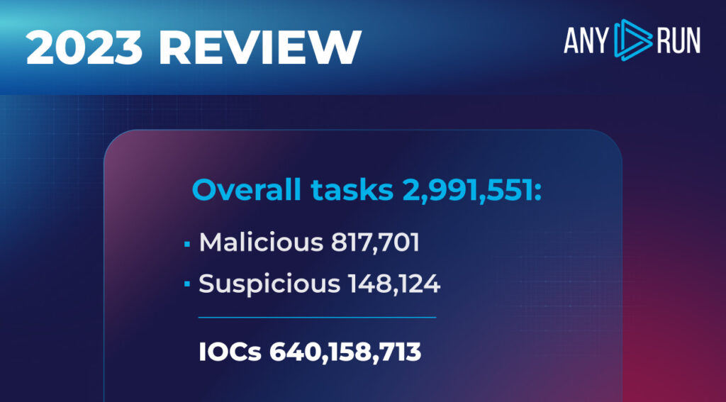 This report is based on the analysis of 2,991,551 public tasks created by our community in 2023. Out of these, 817,701 were tagged as malicious, and 148,124 as suspicious. Overall, ANY.RUN helped the cybersecurity community identify 640,158,713 IOCs in 2023.