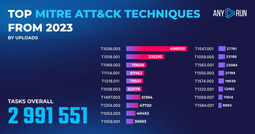 ANY.RUN has a MITRE ATT&CK report that matches malware actions to specific techniques. In 2023, we made over 1.2 million matches, allowing us to put together this spreadsheet of TTPs adversaries employed most frequently in 2023: