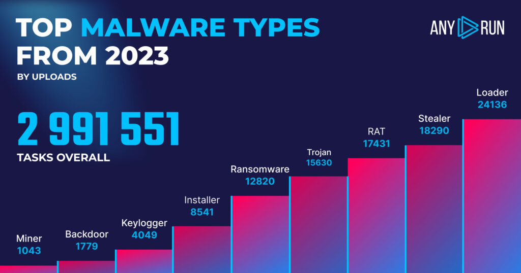 Let’s begin by taking a closer look at the most common types of malware identified by ANY.RUN’s sandbox. In 2023, loaders, stealers, and RATs took the lead with 24,136, 18,290, and 17,431 detections respectively. Around 15,630 detections were attributed to trojans: