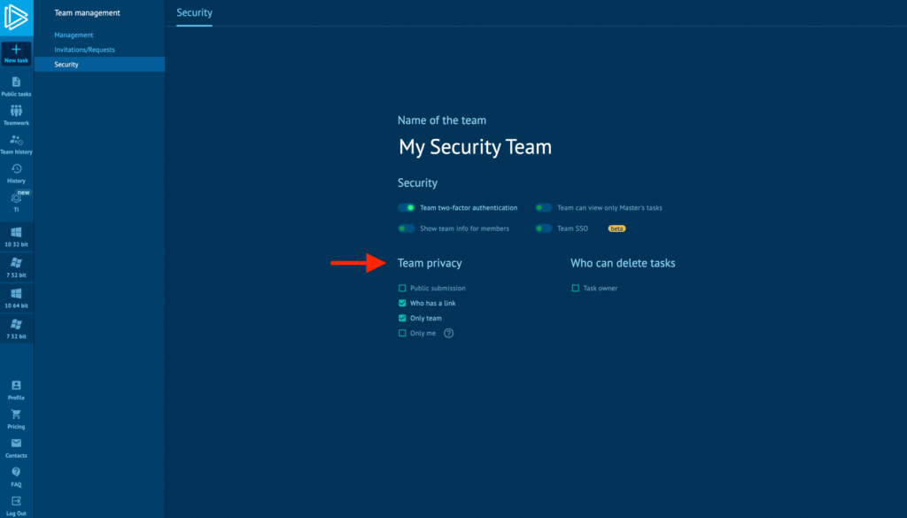 But this scenario is easily preventable by configuring your account settings correctly. In the team privacy settings, you can control what types of tasks your team members are allowed to create. For example, you could restrict junior analysts to only launch private tasks, while prohibiting them from deleting tasks they’ve created.