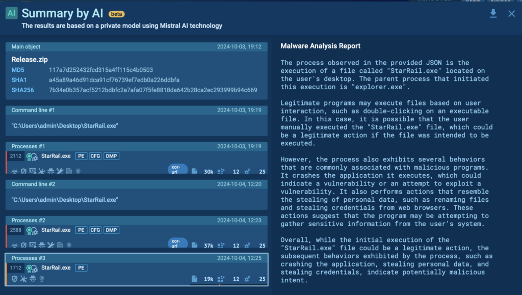 AI summaries: This major update lets you generate focused reports using AI. These reports can cover the entire task or zoom in on specific indicators like processes, command-line activities, or even triggered detection rules. This tool complements your existing behavioral and heuristic analysis methods. Learn more.
