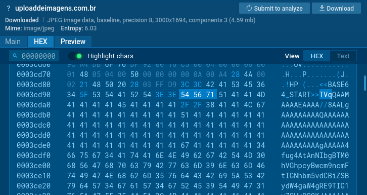 Turning our attention to the image file, a static analysis initially reveals what appears to be a legitimate image. However, upon inspecting the HEX tab and scrolling down, we find the <<BASE64_START>> flag, previously seen in the PowerShell cmd. Right after this flag, we see the text “TVq,” which is the base64 encoded MZ signature for executable files. This confirms the use of steganography to hide malicious code within the image.