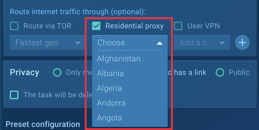 To solve this problem, ANY.RUN has a useful feature called Residential Proxy which allows you to hide your actual location and convinces the software that it’s running on a real user’s machine. You can choose any location, in case it’s targeted malware requiring IP addresses from specific countries: