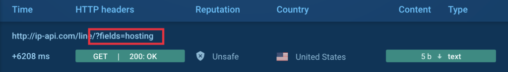 We became interested in investigating the cause of the “crash,” and we found that the user-launched sample and the sample restarted by us exhibited different behavior patterns. Specifically, the restarted sample queries a service to determine the external IP address (MITRE T1590.005) before crashing. Typically, in addition to the IP address, such services provide the ability to determine whether the software is running on a virtual host: